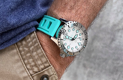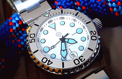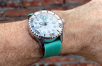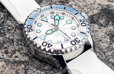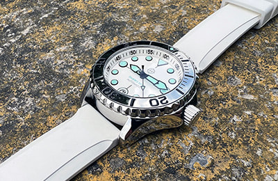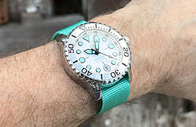 ACCESSORIES:The rubber straps and alternate bezels pictured in some photos at left, as well as the NS2 and NS3 nylon straps, are available separately and at a discount when purchased with a watch. |