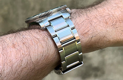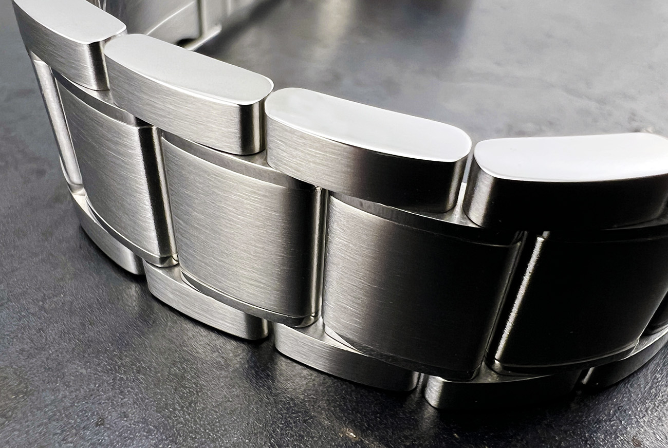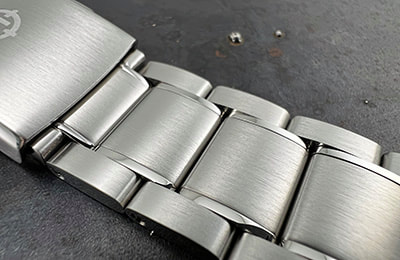 SS4 STAINLESS BRACELET A modestly dressy three-link stainless bracelet with solid case links and a brushed top surface plus polished sides, the SS4 comes standard with the HELM Miyako. Three removable links on each side are secured with single sided screw pins for simple sizing adjustment. The included FC3 folding clasp features a slim profile, a push-button release, four micro-adjustment holes and a brushed finish with a polished edge to match the bracelet. SPECIFICATIONS:
